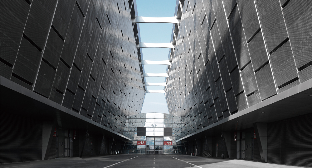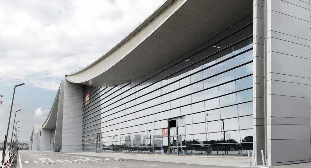 主体场馆集约便利,呈方形布局,共设6组12个单层展馆、6个单向连接厅、2个登录厅、内廊及2个入口广场,室内净展示总面积17.75万㎡,可提供8568个室内展位。登录厅与展厅地块合围展示面积3万㎡,展馆外临滨江路区域展示面积5.5万㎡,总计室外净展示面积8.5万㎡。单层展馆室内净展览面积约1.35万㎡,一期8个单层展馆总室内展览面积约12万㎡,可提供室内标准展位约6000个。
